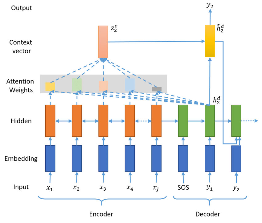 그림을 통해 볼 수 있듯 attention weights는 encoder의 각 hidden state와 현재 time step의 decoder hidden state 간의 유사도를 통해 얻어진다. 이를 합해 context vector를 만들고, context vector와 decoder hidden state를 이용해 다음 단어를 예측한다. 이 예측은 다시 다음 time step의 decoder 입력과 함께 쓰인다. 수식은 다음과 같다.