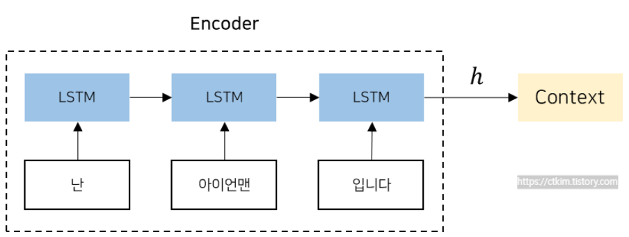 Encoder는 input sequence에서 각 단어를 순차적으로 입력받아 context vector를 만드는 역할을 한다. 이때 각 단어는 embedding layer를 통해 벡터로 변환된다. 결국 time step마다 순환 신경망을 이용해 단어를 입력받고, 최종적으로 마지막 time step의 hidden state를 context vector로 사용하는 것이다.