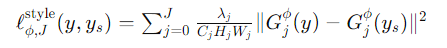 Content Loss์ด๋ค. ฯj๋ ์ ๊ฒฝ๋ง์ jj๋ฒ์งธ ๋ ์ด์ด์์์ feature map์ ์๋ฏธํ๋ค y_hat์ด ์์ฑ๋ ์ด๋ฏธ์ง, y๊ฐ contents ์ด๋ฏธ์ง๋ค.